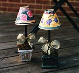 The decorative Shade Trees add a touch of Provence, France to my kitchen window sill. The colorful miniature lampshades are situated over a moss-covered bed and decorative clay container. Don’t really know how I got this idea — but I am thrilled with the end result. And they are “trees” I never have to water. |