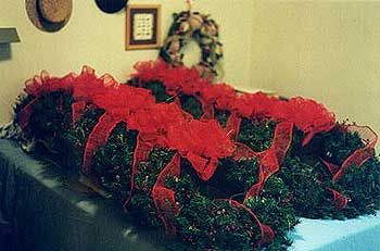 One of four wreath designs created for Nordstrom Giftware departments in Northern Virginia. My version of a classic design uses a generous bow made of red raffia ribbon, realistic red berries and evergreen-like sprays. I made four wreath designs for Nordstrom. It was a busy and festive season. And I got a great kick out of having them select my creations for resale. It was a real honor. |
