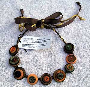 The necklaces and bracelets are designed using carefully selected designer and vintage buttons. I spent a lot of time selecting the colors and patterns for the button groups. Each piece is unique — the buttons are wrapped in wire, silk and organza ribbon. Carmen’s gallery in Solomons Island, Maryland has a few of my pieces available for sale. |